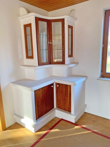 Zahlreiche hochwertige, teils gemauerte Einbaumöbel verbleiben im Haus, darunter ein Eckschrank mit Glasvitrine, TV- und Musikecke, eine Wohnzimmereckbank sowie zwei vollständig vom Tischler gestaltete Arbeitszimmer und eine maßgefertigte Küche.