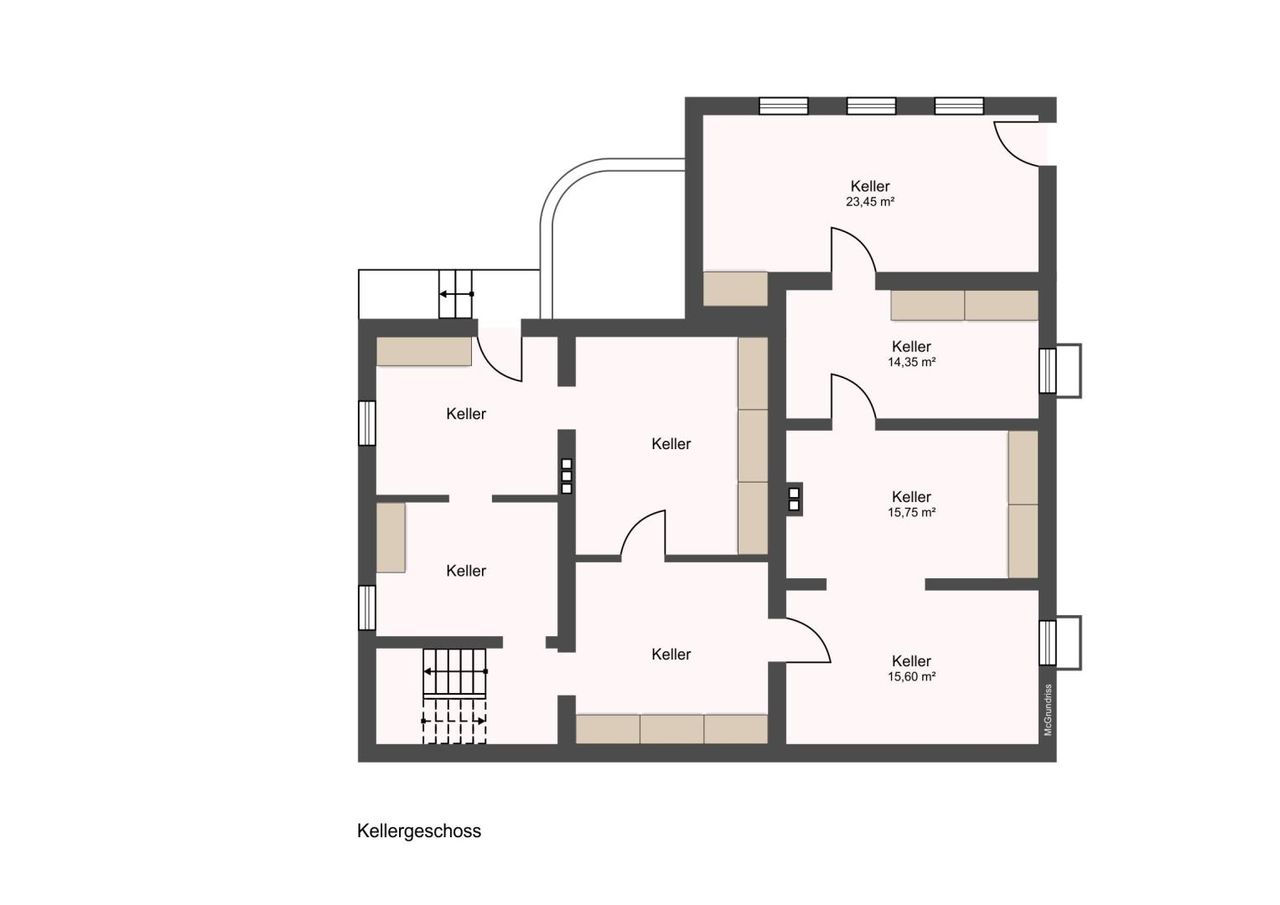 Der gesamte Gebäudetrakt inklusive Terrasse ist unterkellert; auch eine Hälfte der Doppelgarage verfügt über einen Kellerbereich. Die vorderen Kellerräume liegen über Gartenniveau und sind bereits mit Heizkörpern ausgestattet – ideal für Hobby, Lager oder zusätzliche Nutzungsmöglichkeiten. Zwei direkte Kellerausgänge führen in den liebevoll angelegten Garten mit Nussbaum und Obstbäumen.