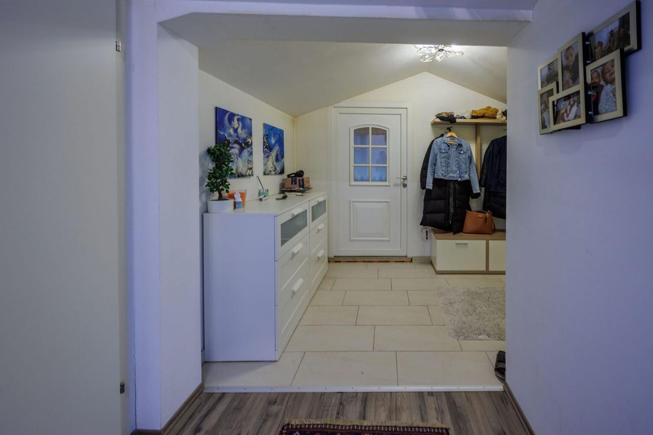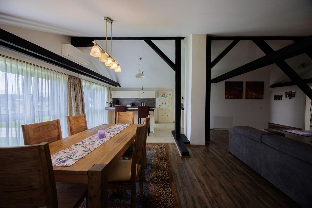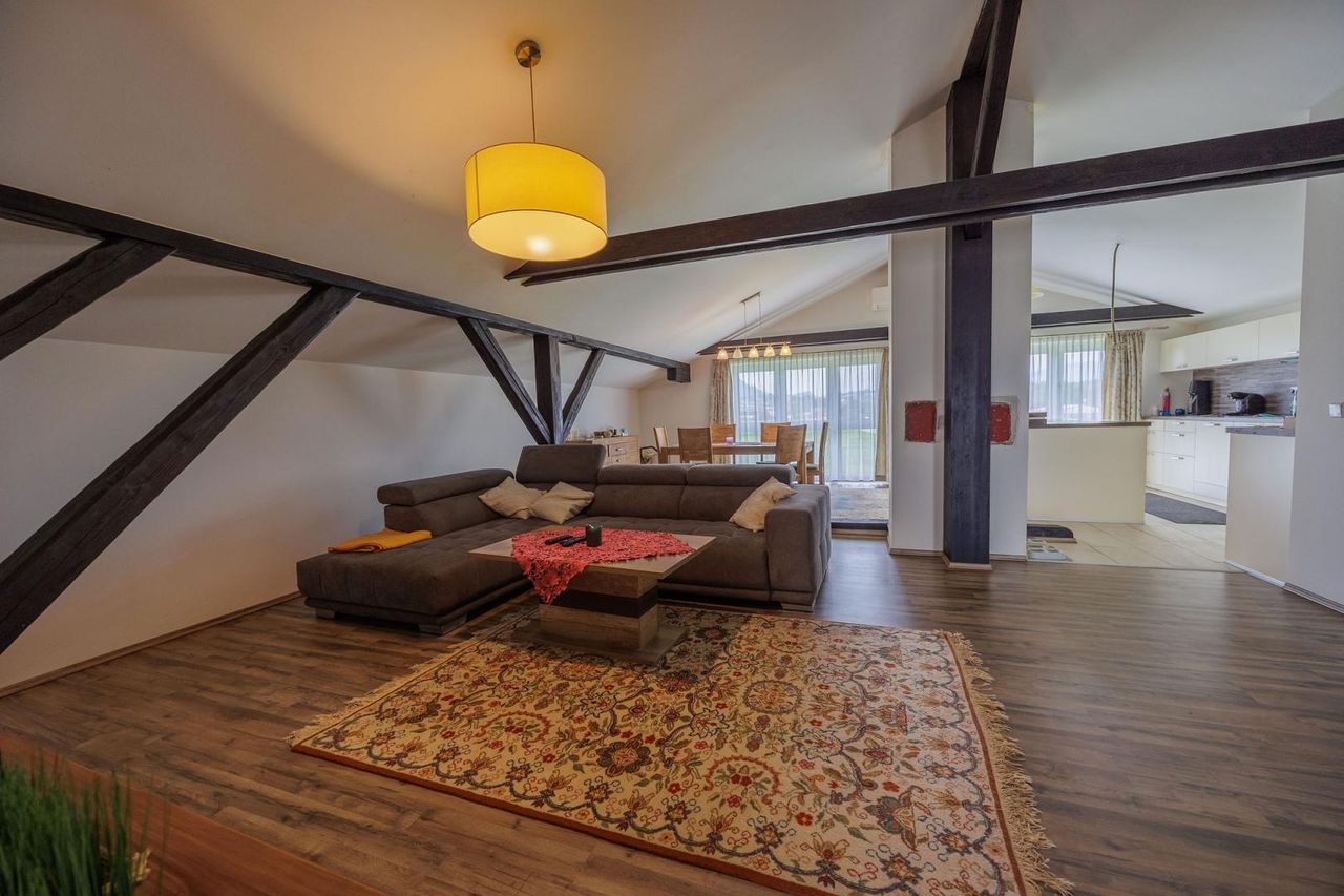 Im Erdgeschoss sowie im ausgebauten Dachgeschoss befindet sich jeweils eine eigenständige Wohnung. Der erste Stock umfasst mehrere Gästezimmer mit Bad und WC, wodurch sich die Immobilie ideal auch für eine Nutzung als Pension oder zur Vermietung eignet. Das Gebäude wurde 1990 errichtet und überzeugt durch seine massive Bauweise (Stahlbetondecken) sowie den gepflegten Zustand.