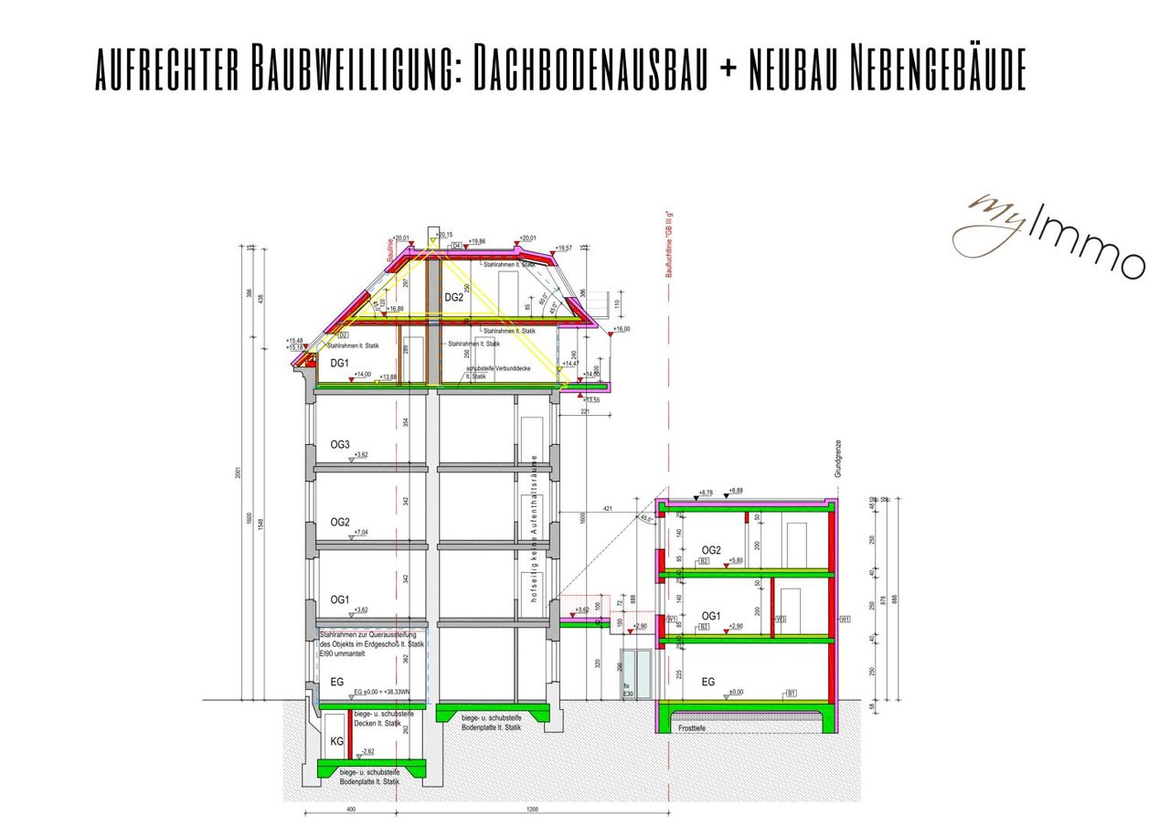 Aufrechte Baubewilligung: Dachbodenausbau + Neubau Hofgebäude