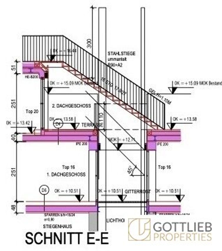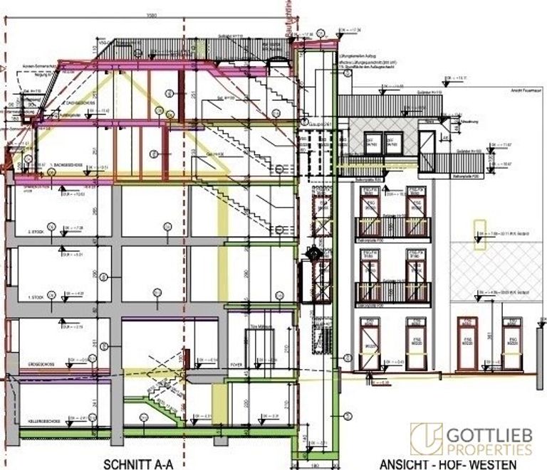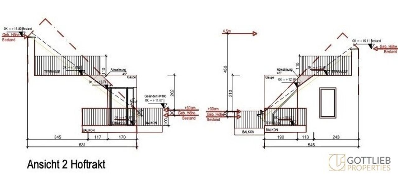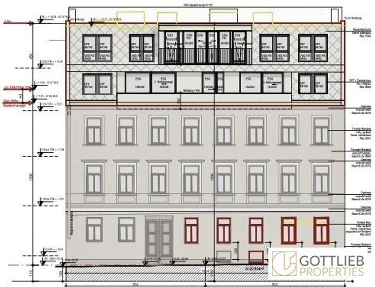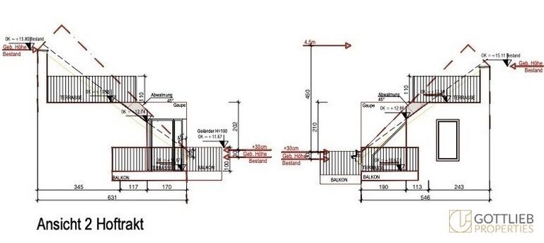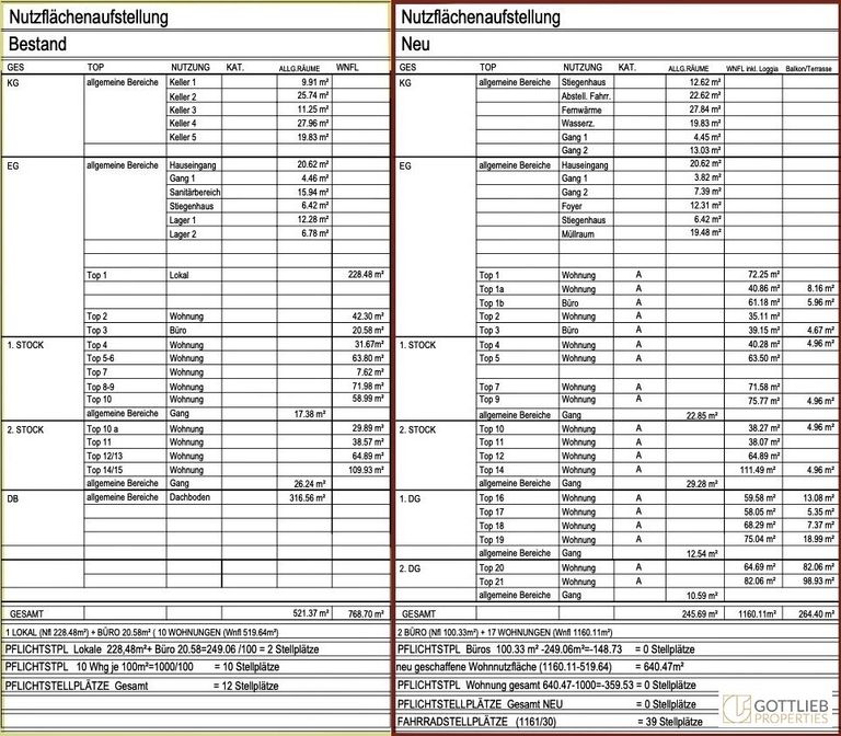 + Abbruch des bestehenden Dachgeschosses und Aufstockung eines 1. und 2. Dachgeschosses zur Erweiterung auf insgesamt 17 Wohnungen mit ca. 1.059,28 m² Wohn-Nutzfläche sowie Terrassen und Balkone von 264,40 m²