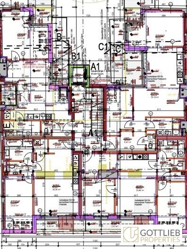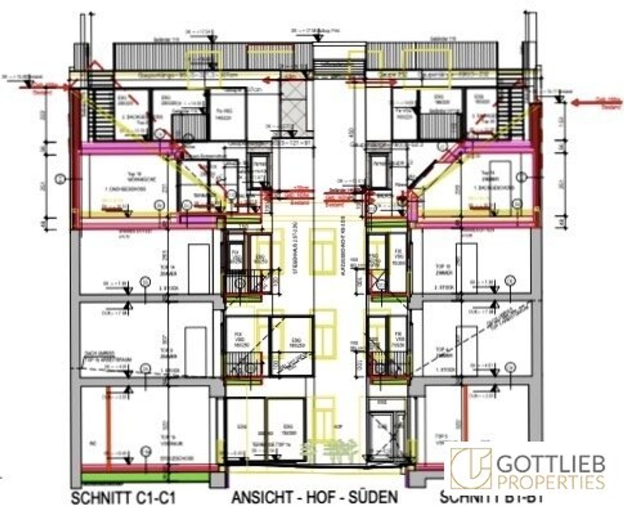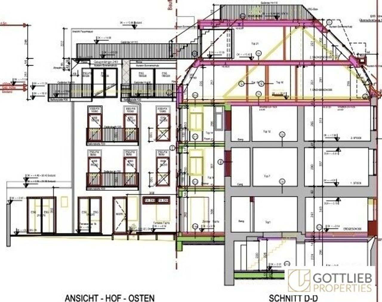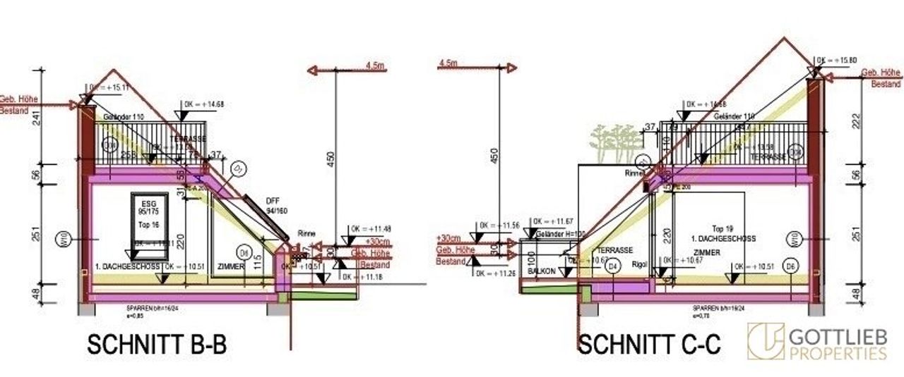 + Abbruch des bestehenden Dachgeschosses und Aufstockung eines 1. und 2. Dachgeschosses zur Erweiterung auf insgesamt 17 Wohnungen mit ca. 1.059,28 m² Wohn-Nutzfläche sowie Terrassen und Balkone von 264,40 m²