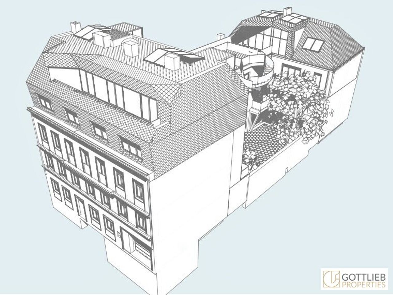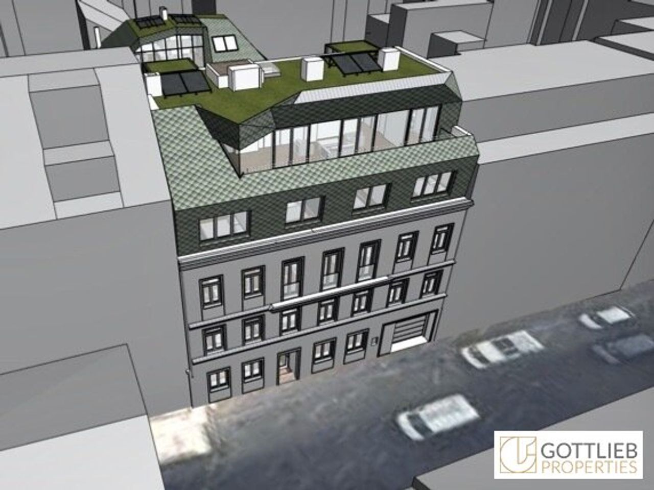+ Errichtung von vier Wohneinheiten im Dachgeschoss mit insgesamt ca. 323 m² Wohnfläche sowie Balkone, Terrassen und Dachgarten im Ausmaß von ca. 61 m²