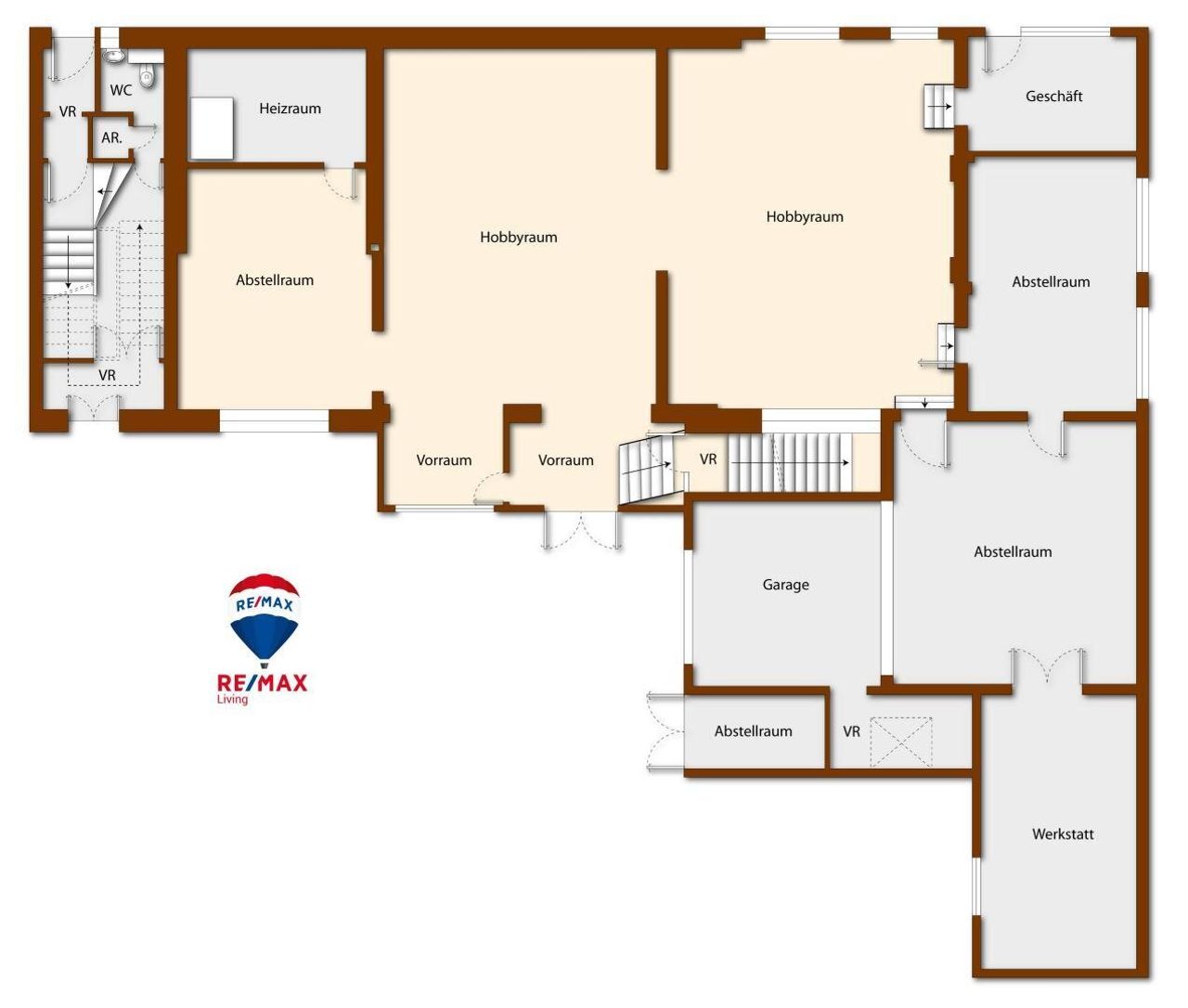 - Erdgeschoss: Geschäftslokal (ca. 12 m²), Werkstatt/Hobbyräume (ca. 370 m²), Garage & Carport (3 Stellplätze)