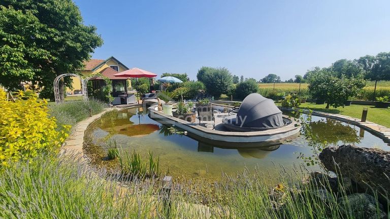 Ein einladender Pool sorgt an warmen Tagen für Abkühlung, während der beeindruckende Naturteich mit elektrisch steuerbarem Wasserfall ein besonderes Highlight darstellt. In der Mitte des Teichs befindet sich eine kleine Insel, die dem Garten eine außergewöhnliche Atmosphäre verleiht.