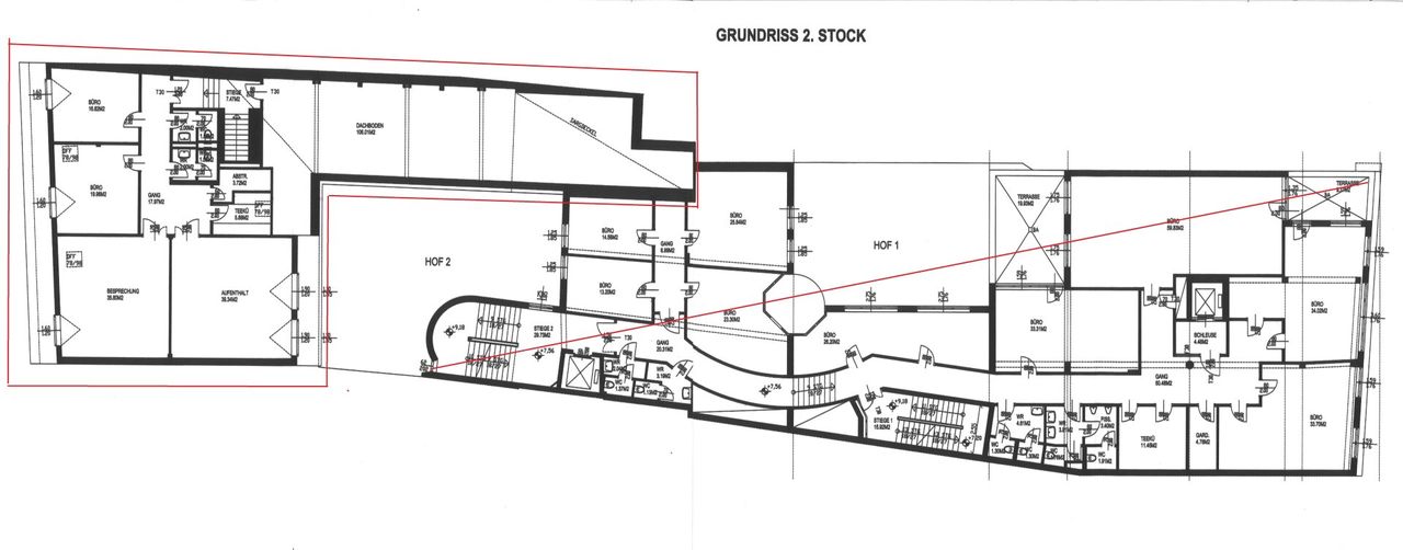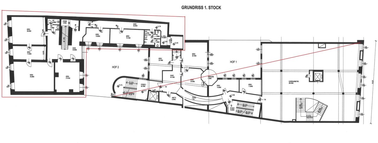 Es besteht aus 581,5 m² Nutzfläche aufgeteilt auf 3 Etagen. Im EG befinden sich 3 Geschäftslokale, im 1. und 2. OG Büroräumlichkeiten. Das 2. OG ist teilausgebaut. Hier befindet sich noch ein Rohdachboden der auch nur von den Büros im 2. OG begehbar ist. Wir nennen es zur Zeit "Stauraum". Diese Fläche ist NICHT in der Nutzfläche mitgerechnet.