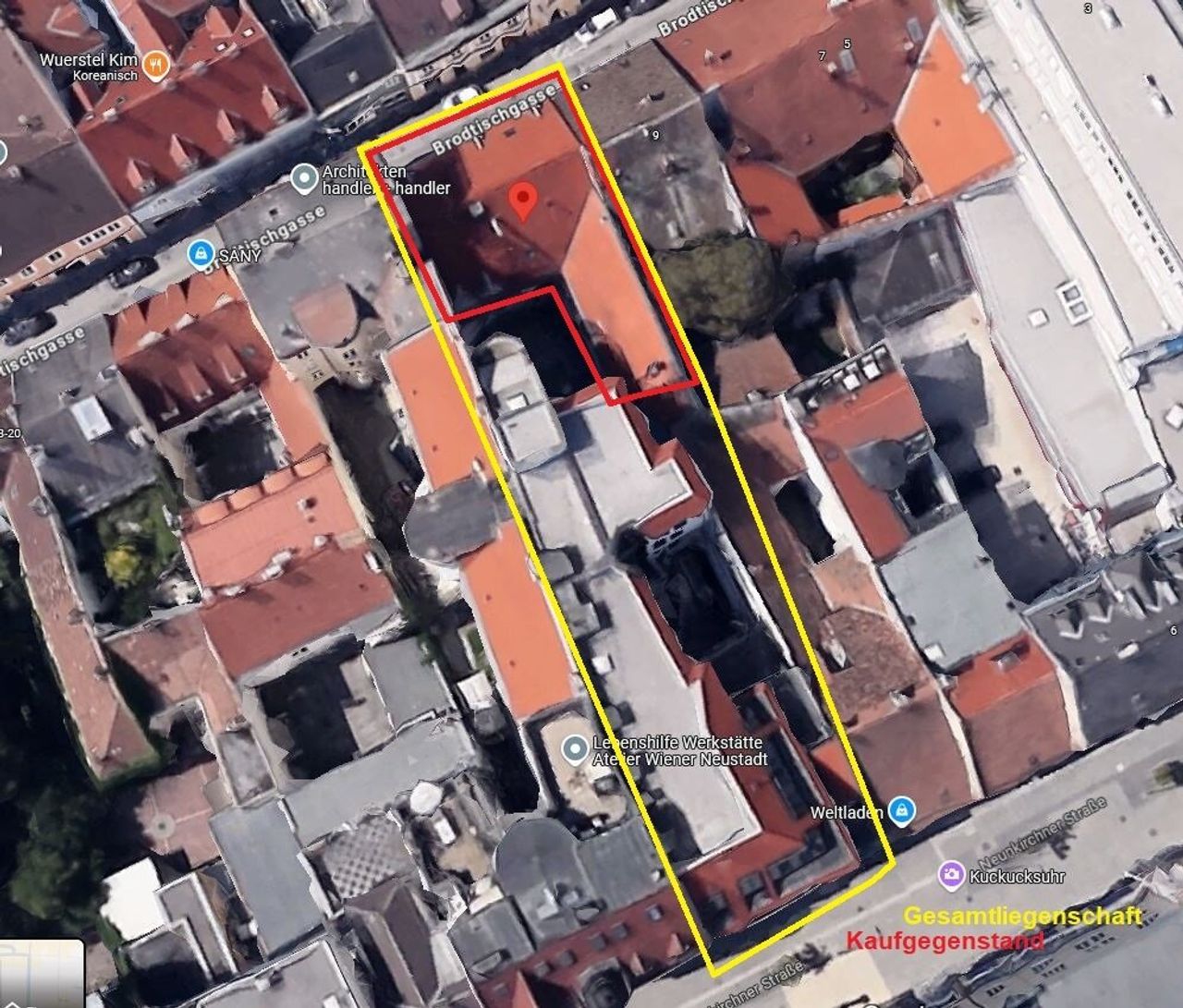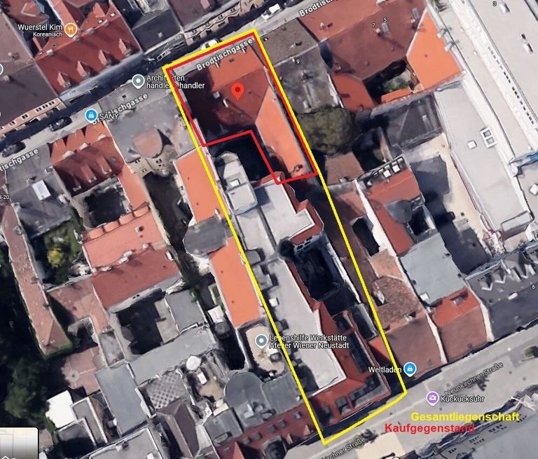 In der Wiener Neustädter Fußgängerzone befindet sich diese Liegenschaft, welche sich aus 2 Bauwerken zusammensetzt: Einem Neubauteil direkt in der Fußgängerzone beginnend und einem alten Bürgerhaus, welches sich direkt anschließt und sich bis zur Brodtischgasse 11 erstreckt. In der Neunkirchner Straße befindet sich der Eingang und über eine Ladenpassage gelangt man zum Ausgang in die Brodtischgasse, oder wenn man will umgekehrt. Beide Seiten haben auch eine Einfahrtsmöglichkeit.