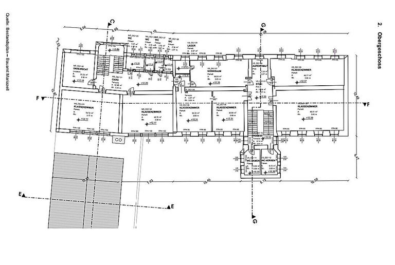 Die Liegenschaft umfasst zwei eigenständige Gebäude, die derzeit miteinander verbunden sind, mit einer Gesamtnutzfläche von ca. 2.114 m². Beide Gebäude verfügen über großzügige Raumhöhen, einer klassische Schulstruktur mit zahlreichen Räumen und sind auch getrennt voneinander zu erwerben.