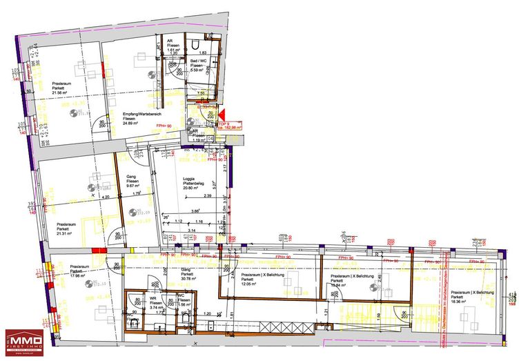 Die Ordinationsfläche im 1. OG umfasst 183m² und 21m² Loggia.